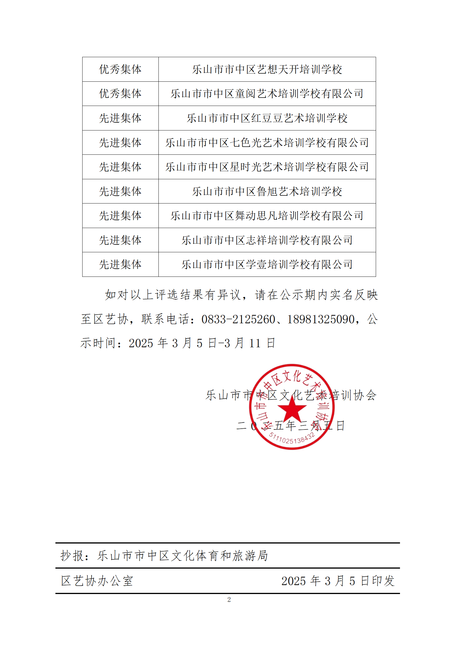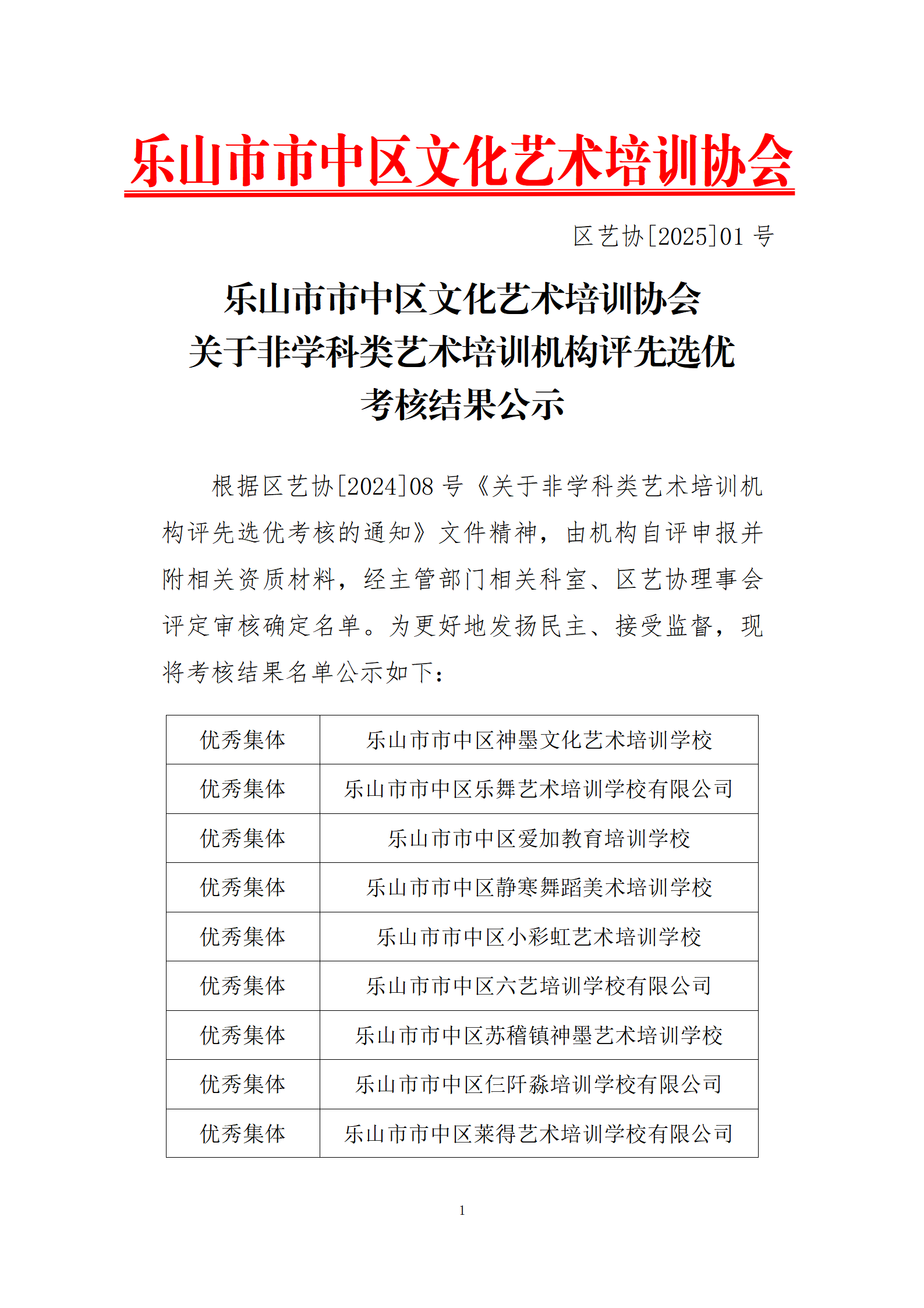 乐山市市中区文化艺术培训协会关于非学科类艺术培训机构评先选优考核结果公示